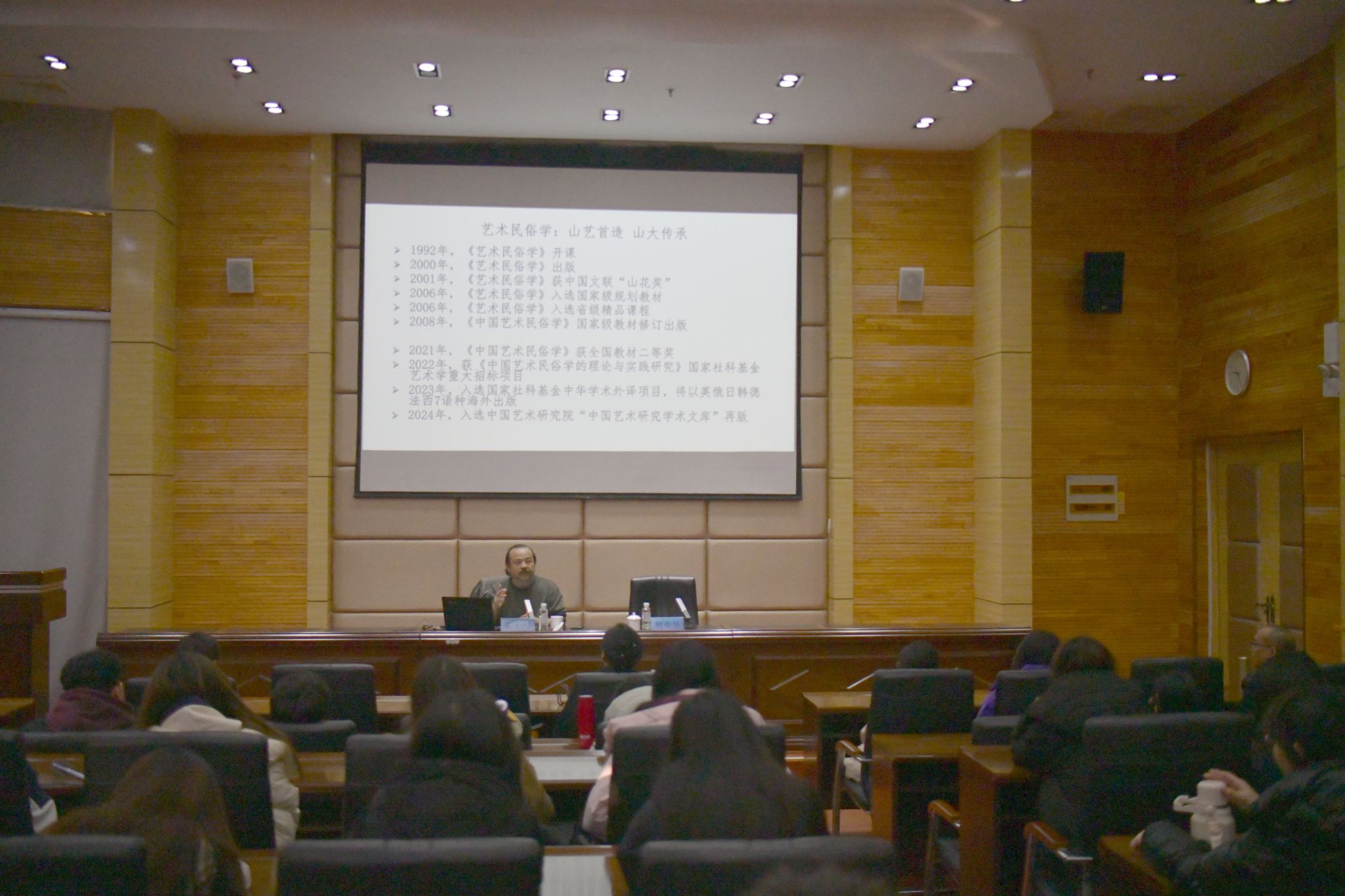 张士闪以非物质文化遗产的古今传承与再造机制为切入点,讲述了当前非遗研究的热点问题与前沿理念。他以传统木板年画为例,结合自身田野经历,阐明非遗图谱是中华文明形态的核心价值体现;从“礼俗互动”与不同层级生活共同体的关系出发,讲授了非遗田野调查的具体方法与注意事项。他强调,非遗是中华文明的生活支撑,鼓励同学们多关注身边的非遗,传承弘扬非遗文化。