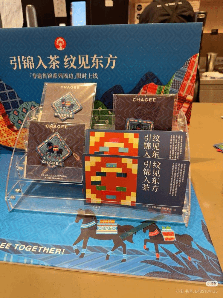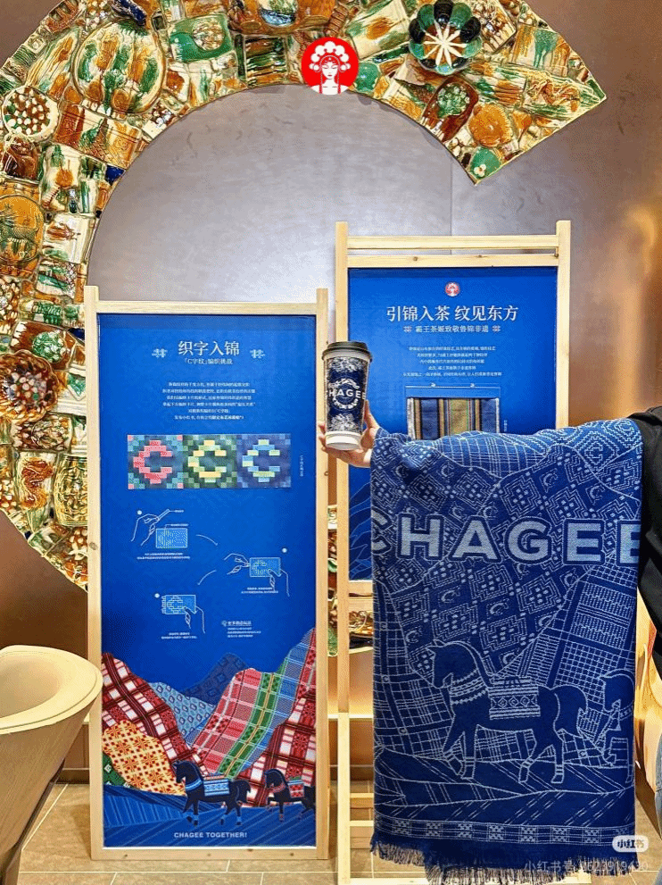 设计团队立足专业视角,深入研析鲁锦独特的美学体系, 精选象征幸福和美的“合斗纹”、寓意国泰民安的“云雷纹”等经典文化符号,与霸王茶姬标志性的“C字符号”进行创造性融合。运用现代设计语言进行创意解构与重组,既保留了鲁锦质朴的传统质感与东方气韵,更注入了符合当代年轻人审美的活力与时尚感,让千年鲁锦在现代语境中焕发出新的生机。这一融合创新成果,完美体现在“引锦入茶 纹见东方”系列限定主题周边及主题门店设计中,成功吸引了年轻消费者的关注与喜爱,让鲁锦文化以耳目一新的方式变得触手可及,真正走进了大众生活。