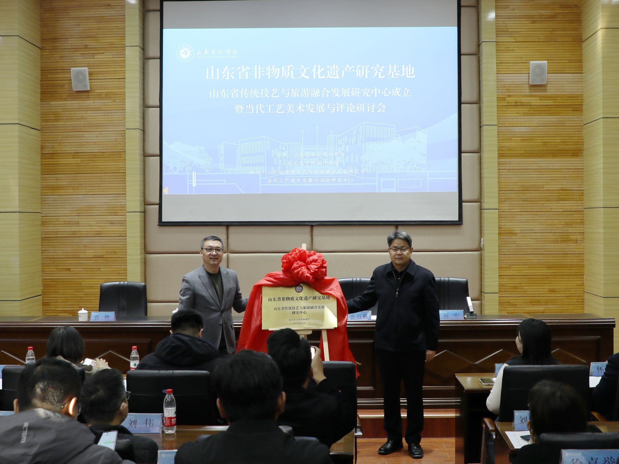 韩文涛与张百科共同为“山东省传统技艺与旅游融合发展研究中心”揭牌。
