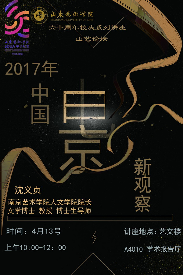 4月13日(周五)上午10:00,南京艺术学院沈义贞教授将做客“山东艺术学院六十周年校庆系列学术讲座•山艺论坛“,主讲“2017中国电影新观察”,地点为艺文楼A4010学术报告厅。
