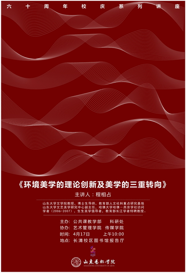 4月17日(周二)上午10:00,山东大学文学院程相占教授将做客“山东艺术学院六十周年校庆系列学术讲座•山艺论坛“,主讲“环境美学的理论创新及美学的三重转向”,地点为长清校区图书馆报告厅。