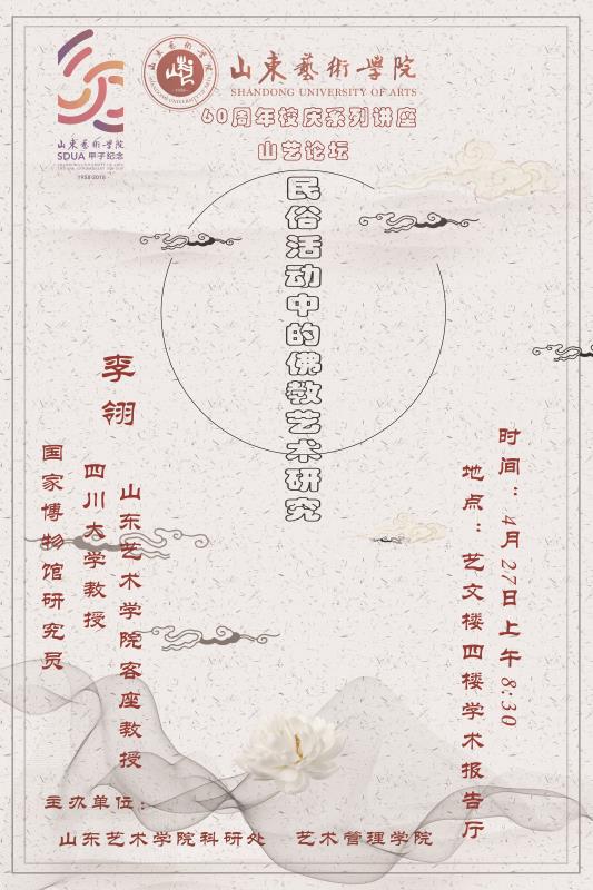 4月27日(周五)上午8:30,四川大学李翎教授将做客“山东艺术学院六十周年校庆系列学术讲座•山艺论坛“,主讲“民俗活动中的佛教艺术研究”,地点为艺文楼四楼学术报告厅。
