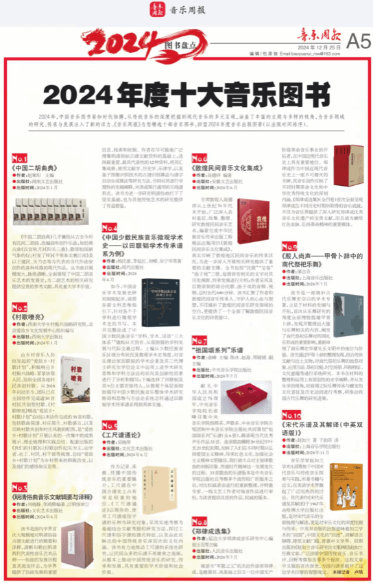 据悉,“中国十大音乐图书”评选由国内音乐界公开发行的权威报刊《音乐周报》组织实施,旨在表彰各年度内在音乐理论、创作、表演、教育、史料整理等领域,具有突出贡献和广泛影响力的优秀图书和音像出版物。